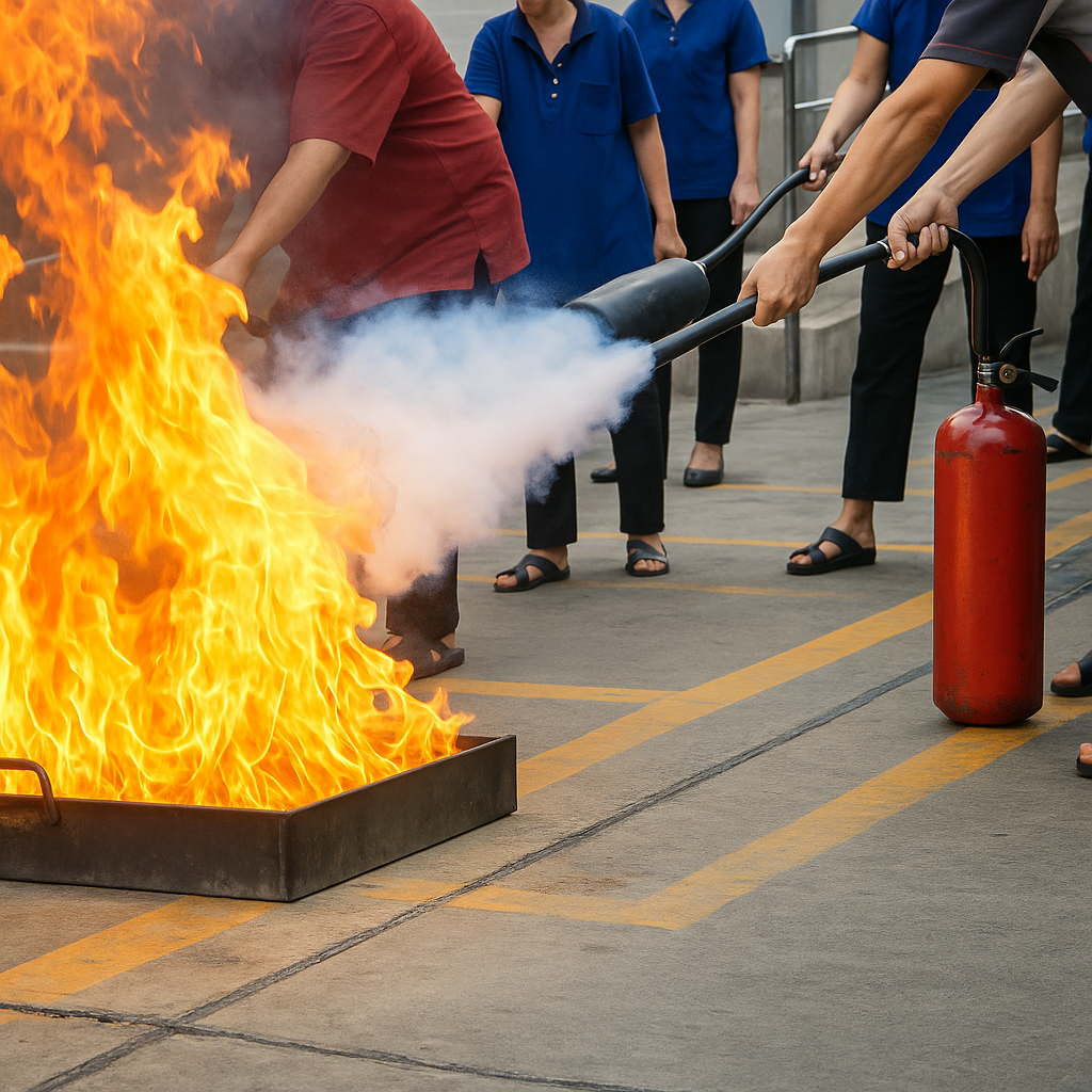 einer praktischen Feuerlöschübung mit echten Löschgeräten.